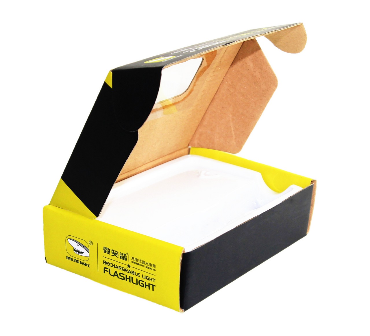 We made this cardboard box for packing flashlight. The cover paper is 250gsm CCNB paper and inside is brown corrugated paper board. There is a small window on top and a blister insert. There are different sizes of boxes for a series of flashlights.