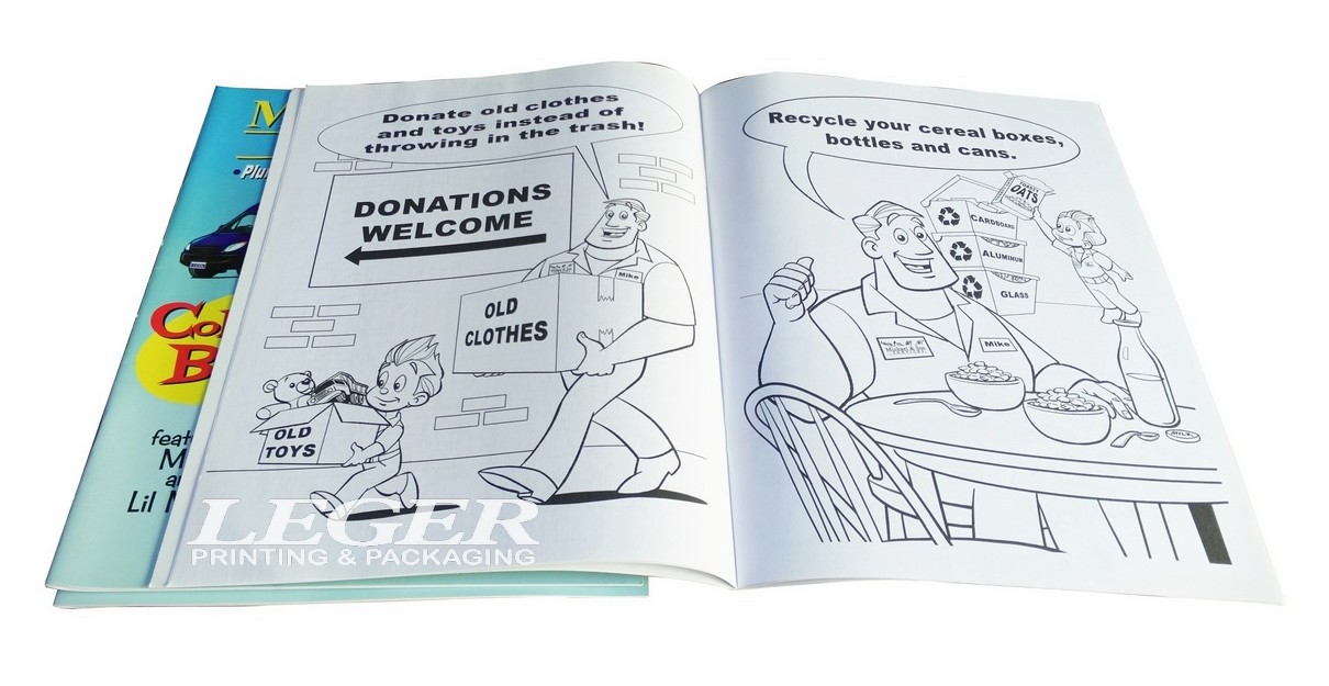We printed many coloring books for our clients every year with competitive price. Coloring books, also called painting books, are usually with colorful printed covers and black printed pages. They are saddle stitch bound.